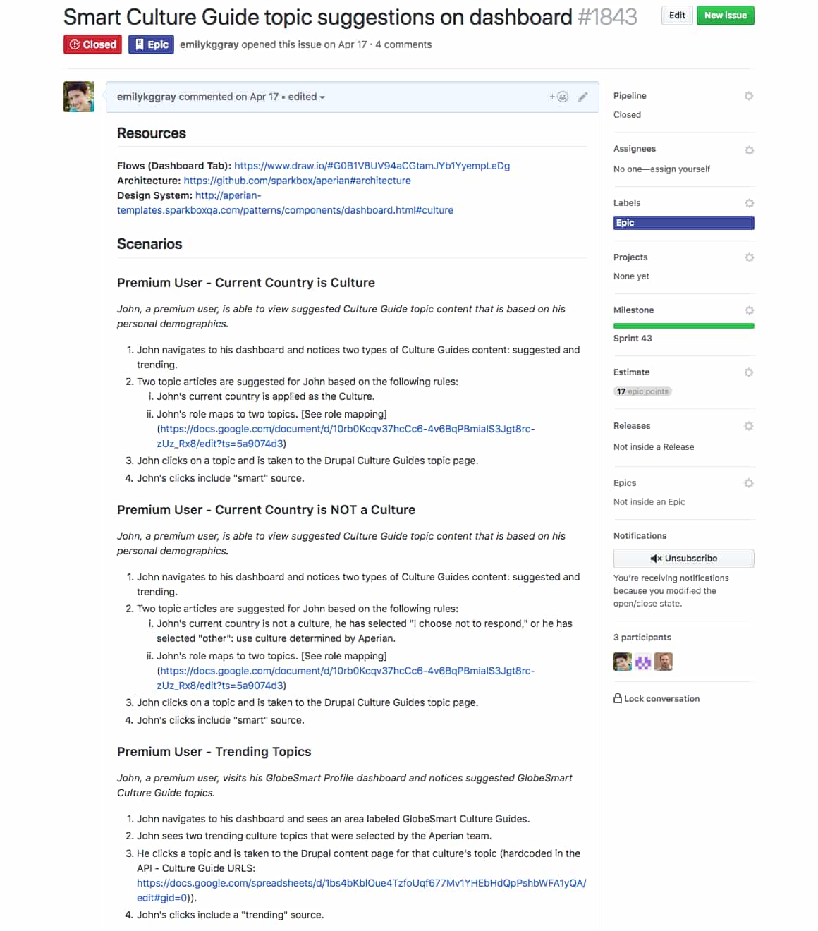 Once features were well planned, we put them through the wringer with scenarios. Based on our knowledge of the features needed, our team would break down all the scenarios a user might run through as part of that feature. And then we met with the Aperian Global team to review and refine those scenarios. Scenarios planning allowed us to take the time each week to identify all the types of users who would be impacted by that epic’s features and the scenarios in which those users would find themselves. Creating scenarios was one of the most powerful tools we had to ensure the Aperian Global team had great confidence in their ability to direct the work, and that we were building the right things. Scenarios also helped us identify and prioritize shippable moments based on just-enough-value feature sets.