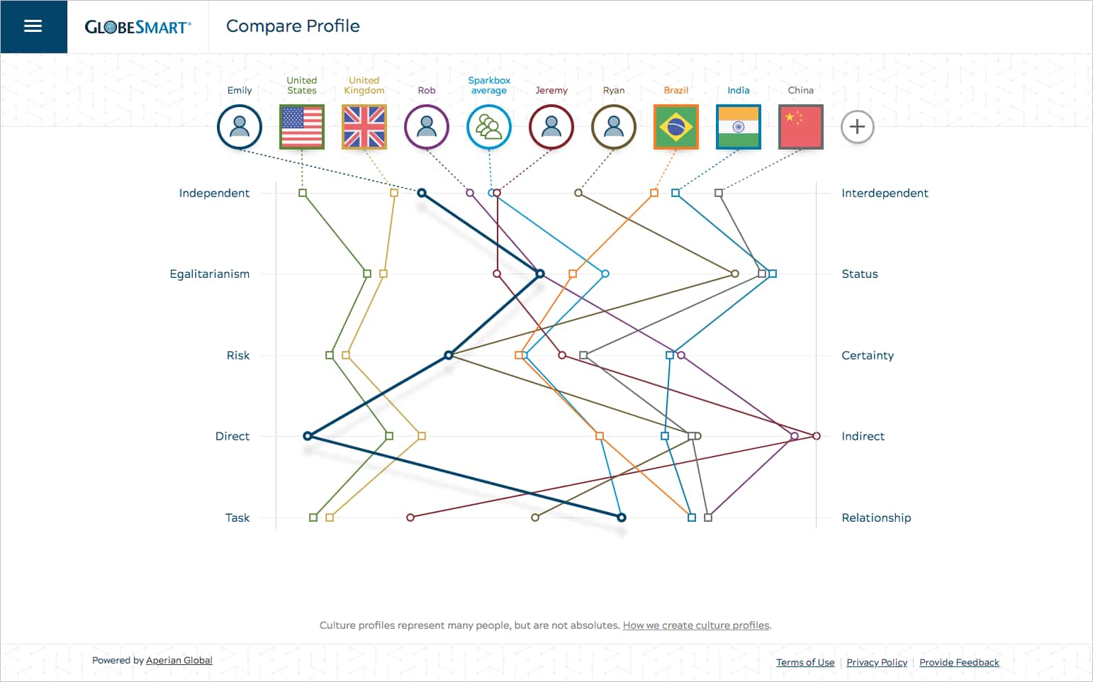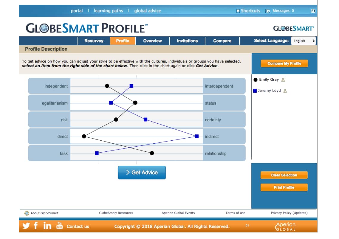 Aperian Global offers trainings and online products to help individuals, teams, and organizations work effectively across boundaries. At its core, Aperian Global’s products are about understanding yourself, the people around you, and how to take the best of everyone to make the best in business. A core feature of Aperian Global’s GlobeSmart product is the “comparisons” tool that allows two or more individuals to gain valuable insight into how to work together more effectively.