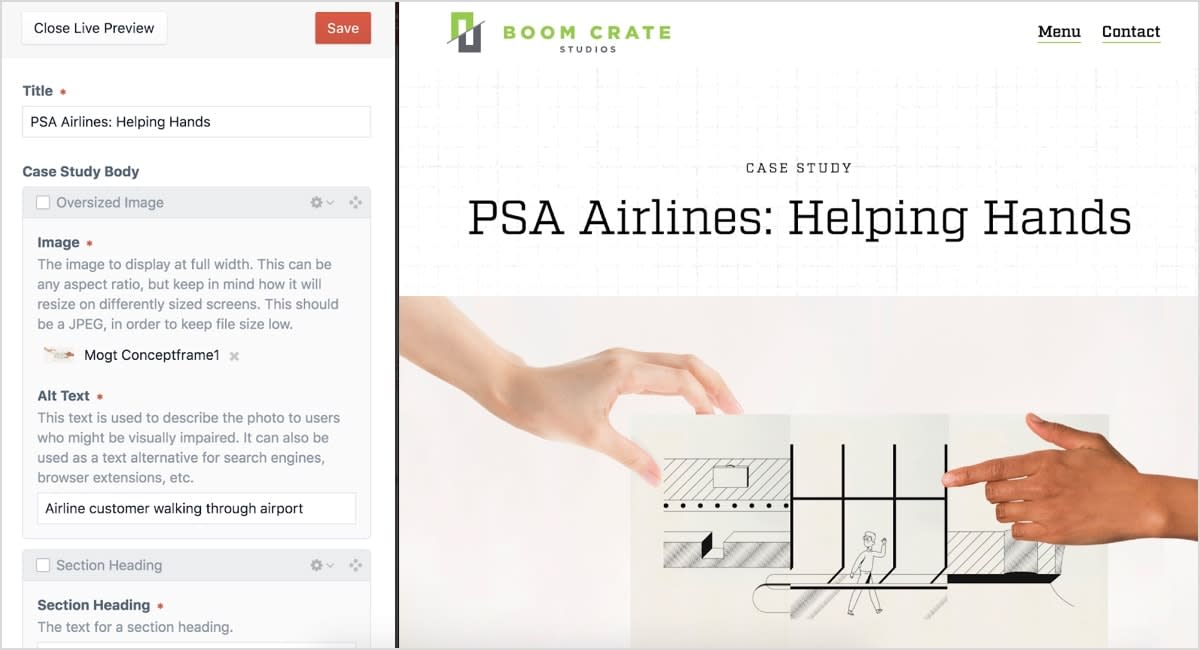 Ease-of-use was another high priority when selecting the appropriate CMS for Boom Crate. And Craft is just that: extremely user-friendly. Managing content starts at the control panel—or dashboard—which has a simple and intuitive design. Because relationships can be built using matrices, users can edit multiple types of content in one section. And the module-like framework makes it easy to build pages in a way that makes sense, giving Boom Crate the opportunity to create unique and dynamic case studies as they add new work. Another user-friendly feature of Craft is the live preview mode, which creates a split-screen viewing experience so the editor can see changes in real-time. Even better, editors can share preview screen URLs before publishing edits, which is a great value-add for Boom Crate’s editorial workflow, especially when getting client approval for case studies.
