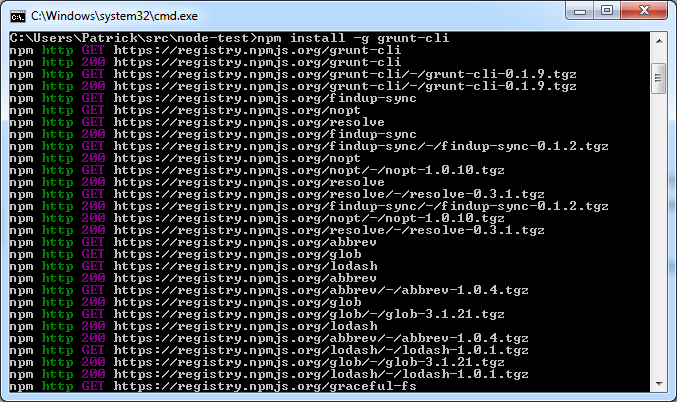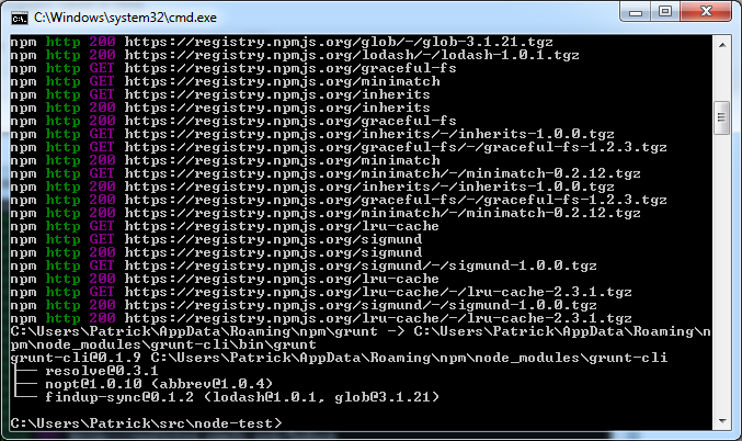 Next, you’ll need to run the “npm install” command in the directory. This will install a lot of node modules required to make the project-init work. After “npm install” installs all the modules—some may fail, but that’s ok, because they’re not needed entirely—you will then run “grunt” in your command-line: