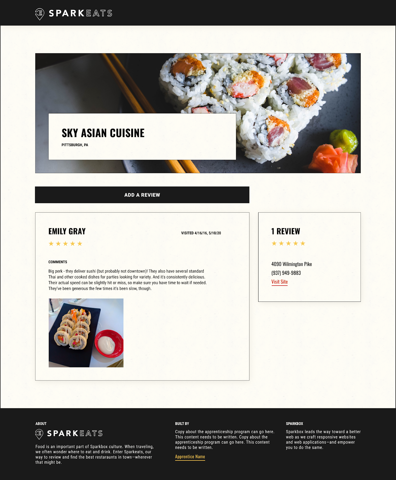 At the top of the page, I’ve highlighted the “site header.” This includes the SparkEats logo, which likely operates as a link back to the homepage. Many other sites will include a navigation bar or “hamburger” in this top section, and I would probably separate the navigation into its own block of work.